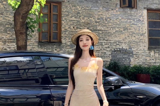 Collared Zip-Up Plain Jacket / Spaghetti Strap Plaid Midi A-Line Dress / High Rise Asymmetrical Layered Lace Skirt / Fringed Bonnet Hat / Belt / Set