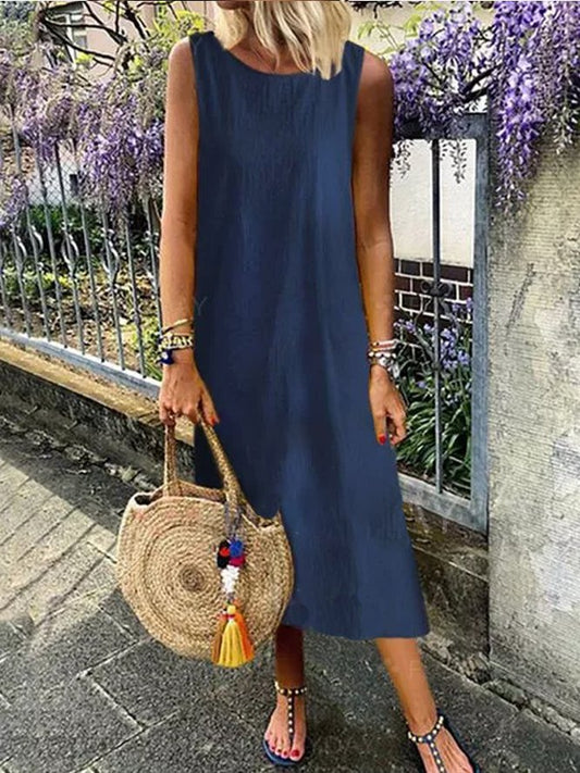 Loosen Cotton Crew Neck Sleeveless Woven Dress QAH50