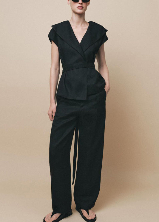 Neck Black V Set Cotton Waist Tie Slim Summer Pieces Two Fit