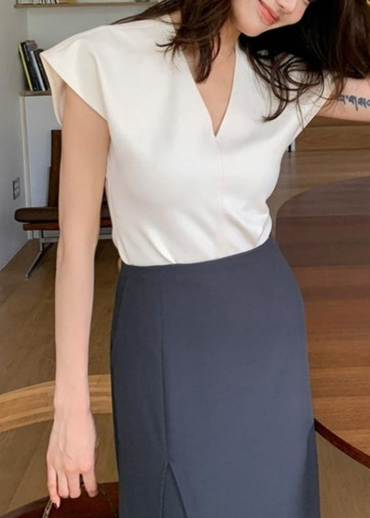 Blouses Neck Open V White Cotton Sleeveless Women Front