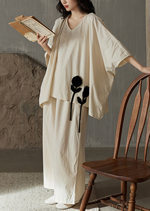 Elegant Beige Neck Cotton Floral V Two Set Pieces Waist High
