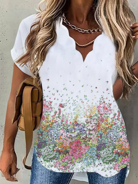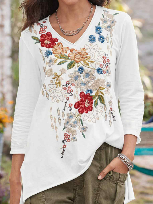 Floral Casual V Neck Embroidery T-Shirt QAF38
