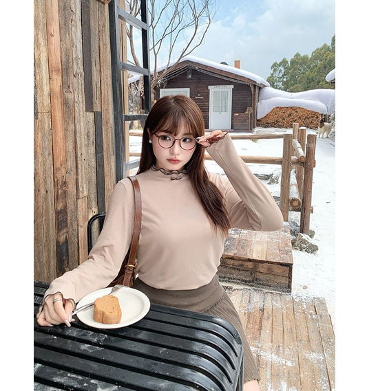 Long-Sleeve Halter Neck Mock Two-Piece Plain Bow Accent T-Shirt
