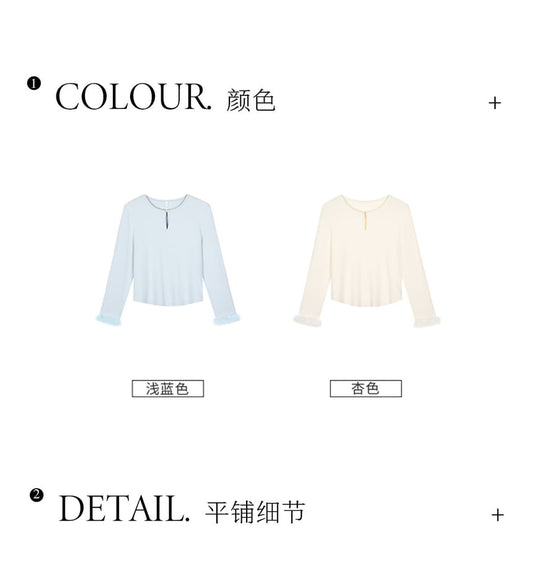 Long Sleeve Round Neck Plain Detachable Fluffy Trim Keyhole Top