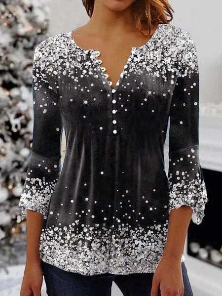 Holiday gradient flower half open button loose pleated top T-shirt ap87