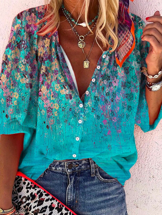 Floral-Print Casual Floral Shirt Collar Tunic Blouse CZ53