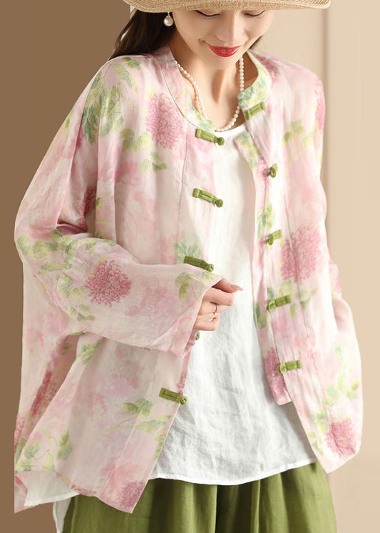 Oriental Oversized Vintage Top Shirt Pink Linen Print Summer