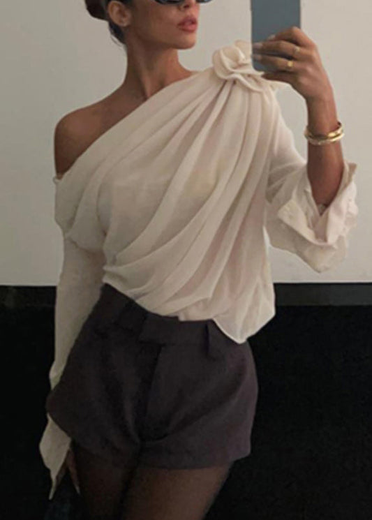 Beige Cotton Tops Fine Embroidered Shirt Summer