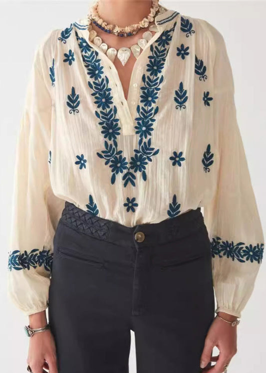 Beige Sleeve New Top Embroidered Puff Cotton Shirt