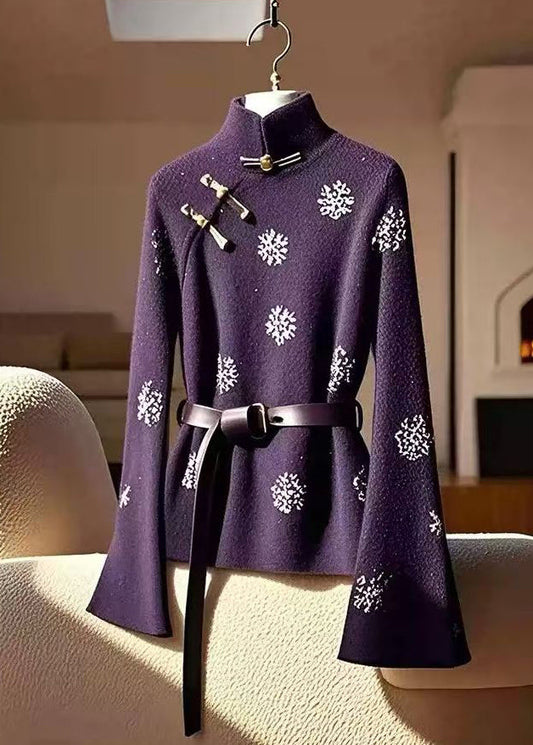Italian Purple O Neck Thick Print Knit Sweater Tops Winter TO001