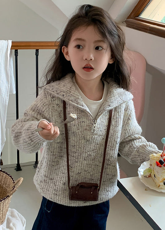 Handmade Light Grey Zippered Patchwork Cotton Knit Girls Sweater Tops Spring TP028