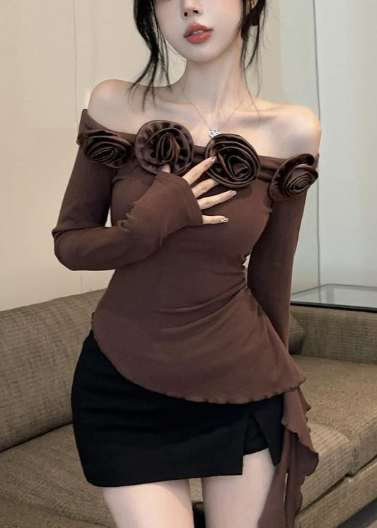 Slim Fit Coffee Asymmetrical Floral Top Spring RP015