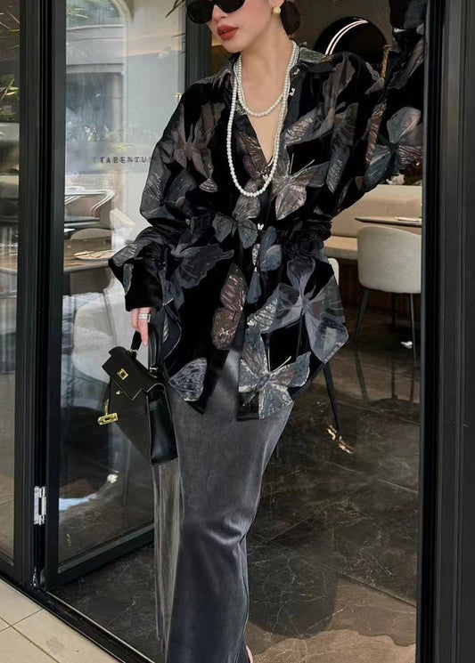 Chic Black Peter Pan Collar Butterfly Silk Velour Top Fall WP033