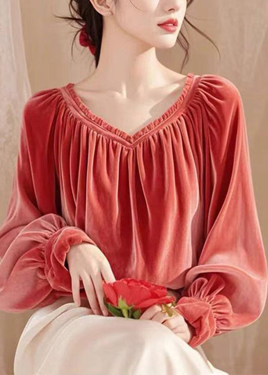 French Pink O Neck Wrinkled Velour Top Fall WP034