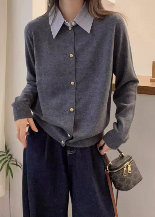 French Black Peter Pan Collar Button Patchwork Knit Top Fall QX002