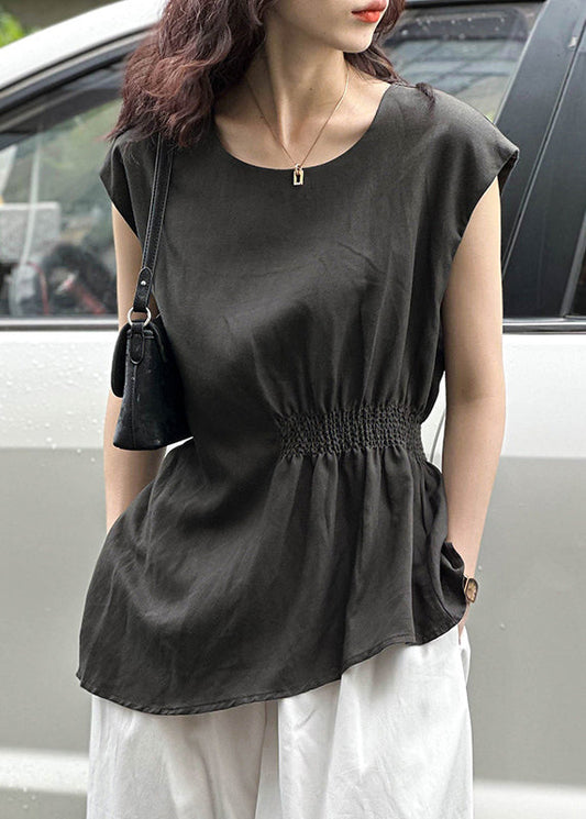 Black Cozy Solid Linen Tops O Neck Summer AF1023