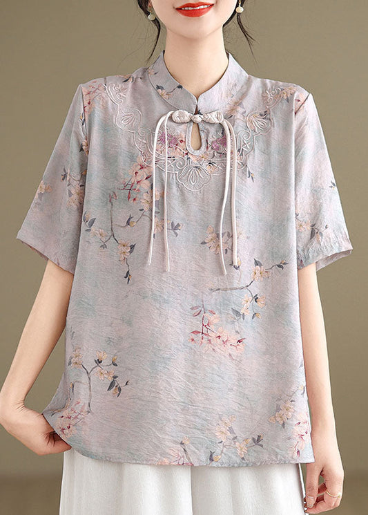 Handmade Pink O-Neck Print Embroidered Button Top Half Sleeve AP012