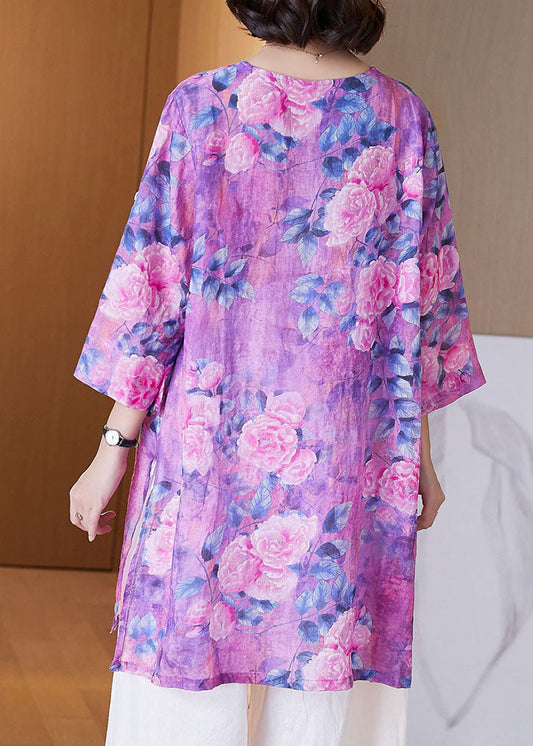Purple Print Loose Linen Tops O Neck Bracelet Sleeve AP019