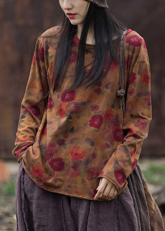 Natural Green O Neck Print Cotton T Shirt Top Long Sleeve LK011