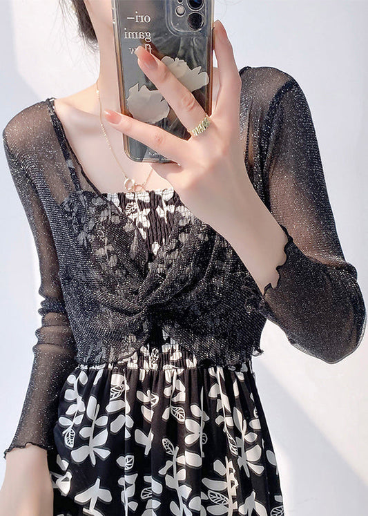 Black Ruffled Thin Tulle Top V Neck Summer AS1036