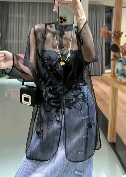 French Black Stand Collar Embroidered Button Tulle Top Summer QA1028