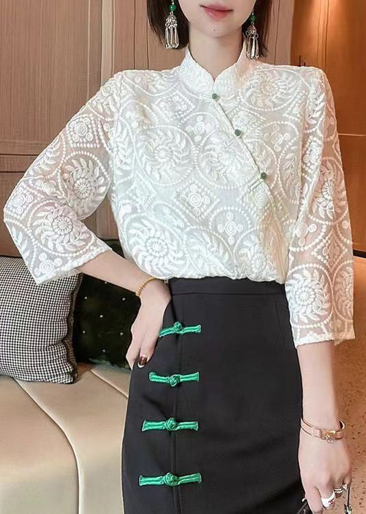 Slim Fit White Stand Collar Embroidered Button Tulle Top Bracelet Sleeve QA1092