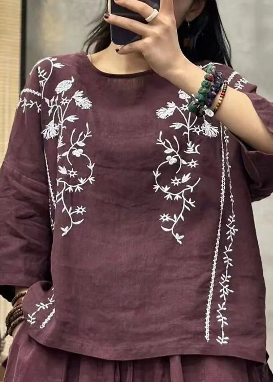Loose Purple O Neck Print Cozy Cotton Knit Top Summer ML3352
