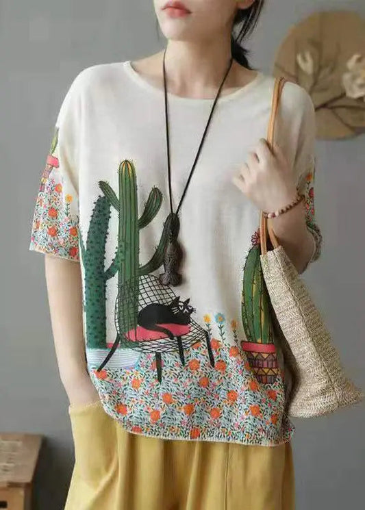 Loose Big Flower O-Neck Cozy Cotton Knit Top Short Sleeve ML3373