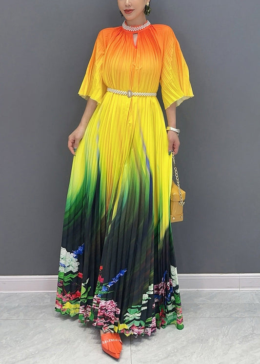 2024 Sommermode Orange Gelb Farbe Blockiert Lange Plissee Kleid AO1020