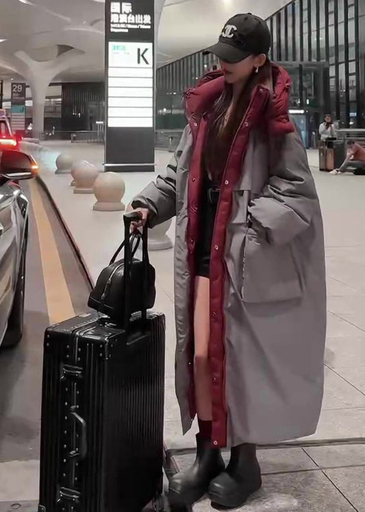 Stilvoller, übergroßer, grauer Patchwork-Gänsedaunen-Trenchcoat für den Winter, beidseitig tragbar, YO002