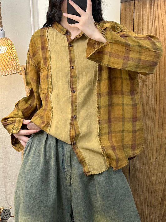 Damen Vintage Kariertes Colorblock-Leinenhemd mit Knopfleiste AT1014