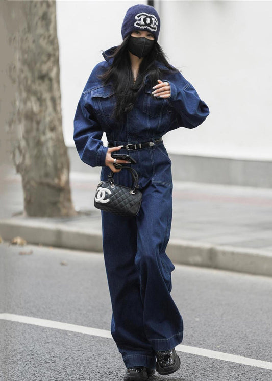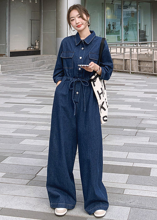 Französischer blauer Jeans-Overall mit Peter-Pan-Kragen und Taschen, Herbst MN049
