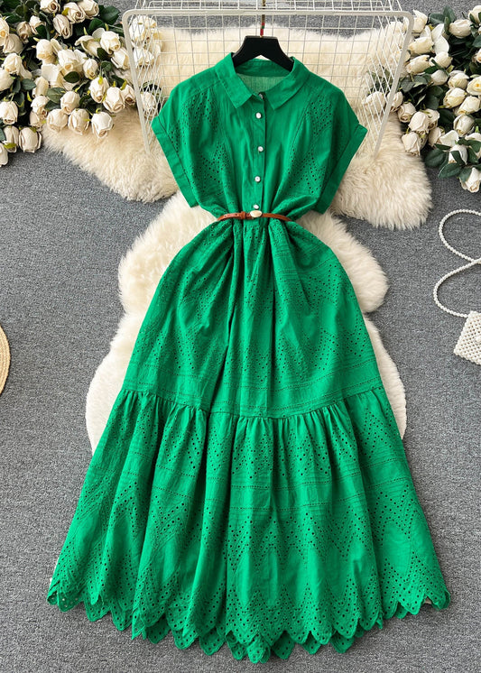 Art Grün V-Ausschnitt Print Bindegürtel Baumwolle Mittellanges Kleid Sommer TR038