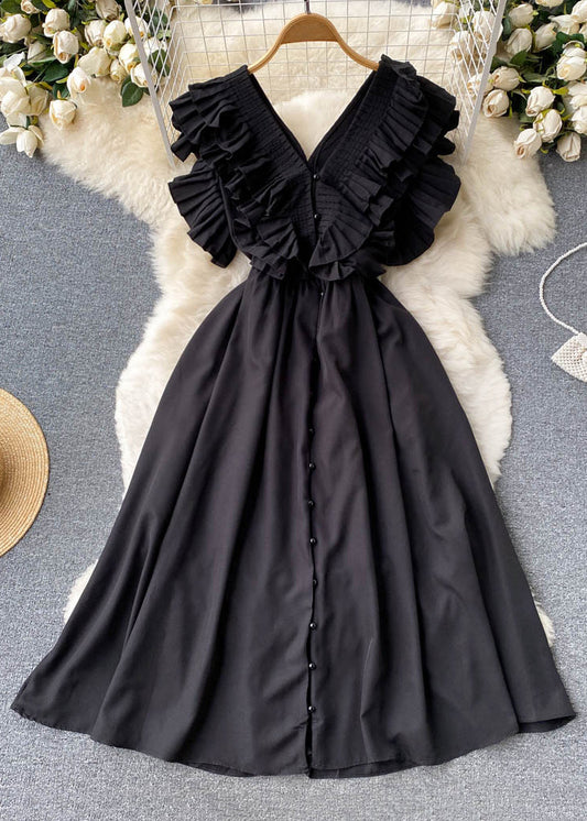 Schwarze Baumwollkleider Peter Pan Kragen Knopfleiste Taille Sommer AP004