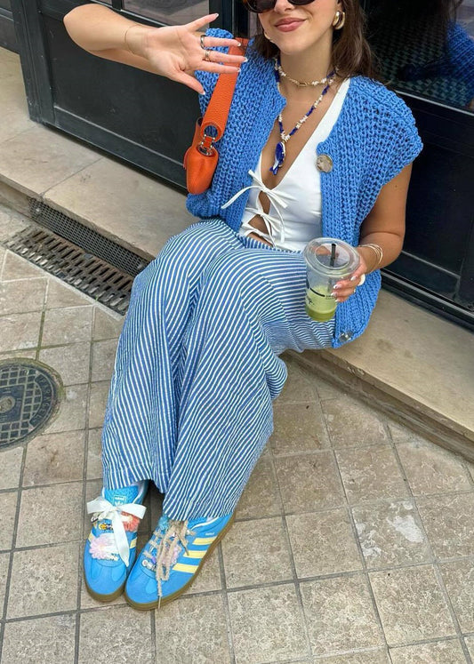 Schicke blaue Strickweste mit Taschen und Knopfleiste, ärmellos, QY012