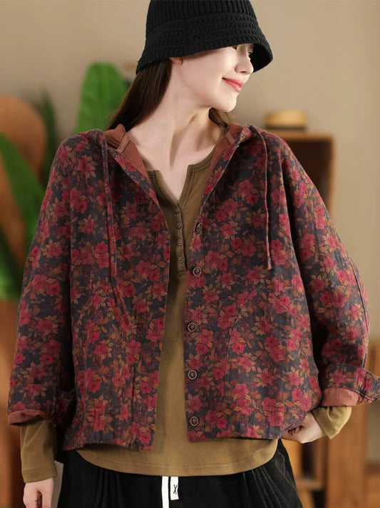 Damen Vintage Herbst Blumen Knopf Baumwolle Leinen Kapuzenmantel AH1013