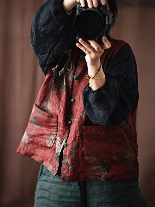 Frauen Herbst 100% Leinen Vintage Patchwork Lose Weste AH1029