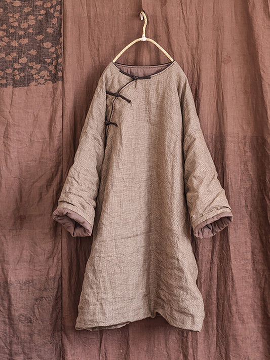 Frauen Vintage Herbst Reine Farbe Schnalle 100% Leinen Mantel AH1084