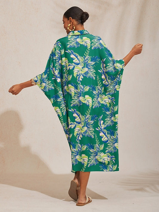 Leaf Print Shirt Short Sleeve Midi Chiffon Dress