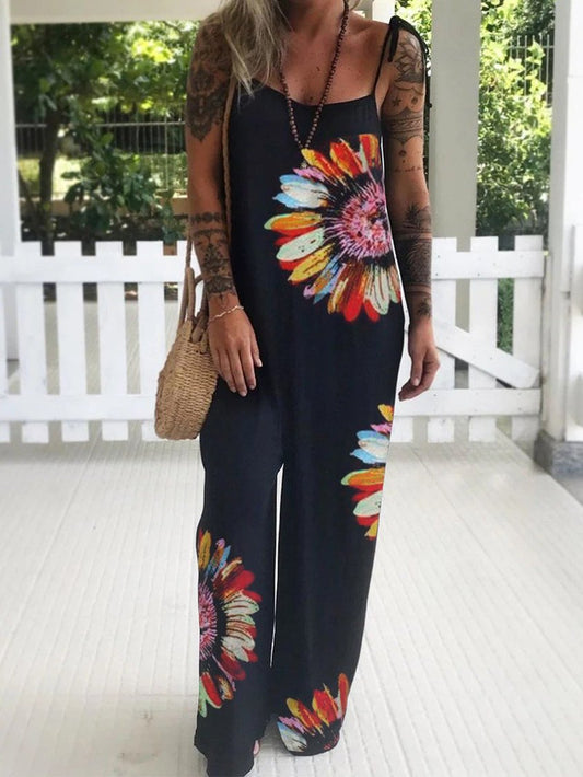 Schwarzer lässiger Jumpsuit und Strampler mit Blumenmuster und Spaghettiträgern QAJ59
