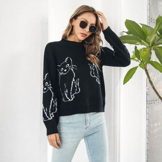 Pullover mit Rundhalsausschnitt und Katzen-Print FR105
