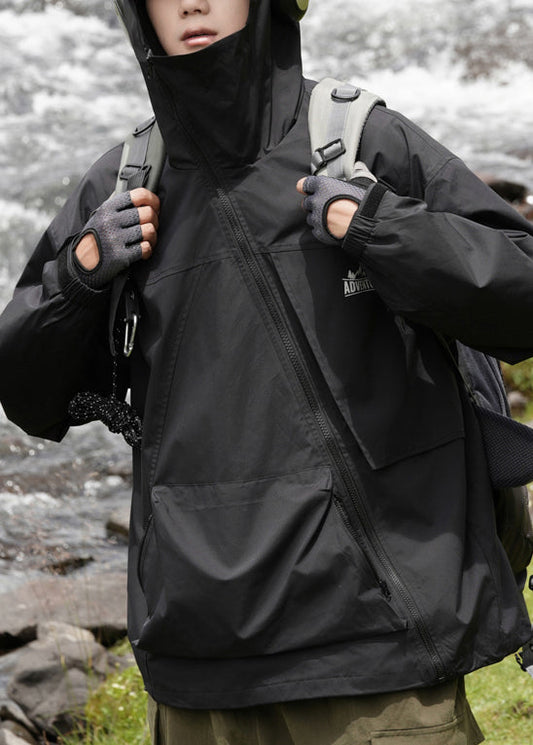 Solide Taschen Baumwolle Schwarz Lose Kapuze Herren Frühlingsmantel