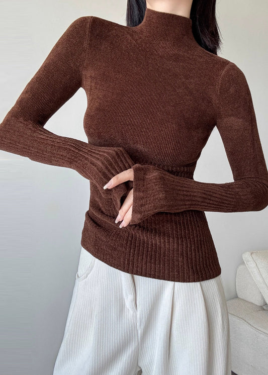 Brauner Strickpullover mit Stehkragen und schmaler Passform, Frühling, YP027