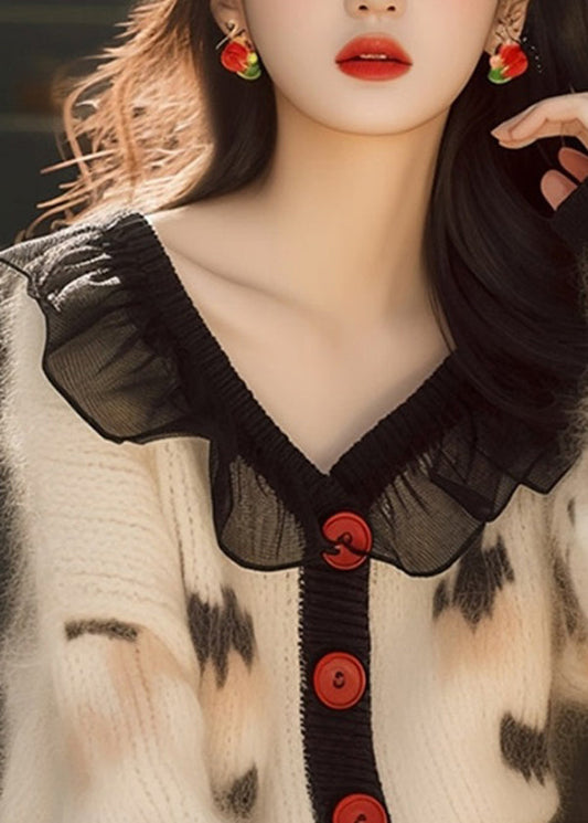 Französische weiße Strickjacken mit Rüschendruck und Knopfleiste, Frühling TN031