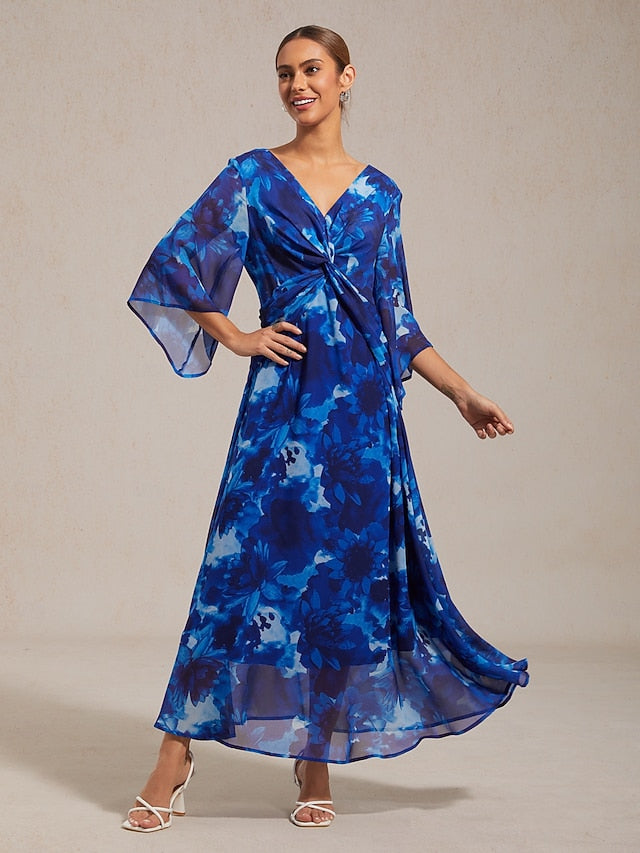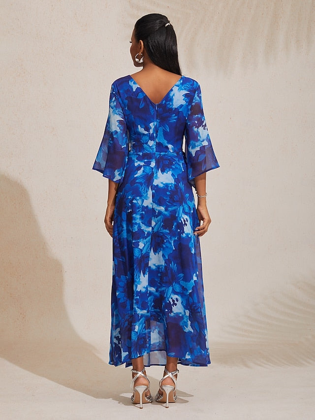 Dresses Type: Casual Dress, Fabric: Chiffon, Gender: Female, Design: Floral, Occasion: Casual, Style: A-line, Elegant, Modern, Print Type: non-printing, Neckline: V Neck, Round Neck, Sleeve Length: 3/4 Sleeve, Short Sleeves, Elasticity: Inelastic, Look After Me: Hand wash, Dress Length: Midi, Pattern: Floral, Season: Summer, All Seasons, Spring, Looseness: Regular Fit,