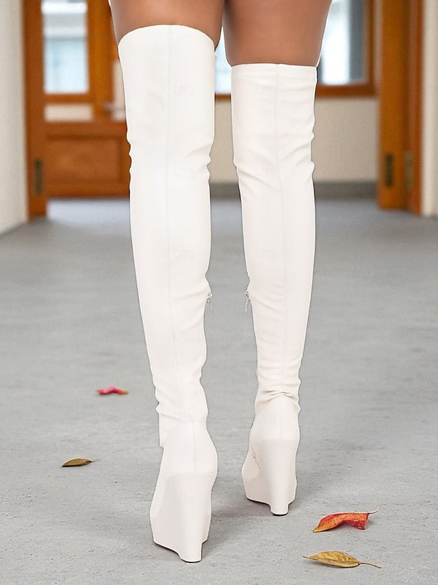 Gender: Women's, Category: Boots, Style: Fashion, Vacation, Sexy, Type: Over The Knee Boots, Occasion: Party, Wedding, Activity: Walking, Toe Shape: Round Toe, Upper Materials: PU, Lining Materials: Synthetic Leather, Outsole Materials: Rubber, Season: Winter, Fall, Summer, Spring, Size Suggestion: standard size, select your usual size, Closure Type: Zipper, Heel Height(inch): 4.72, Heel Type: Platform, Wedge,