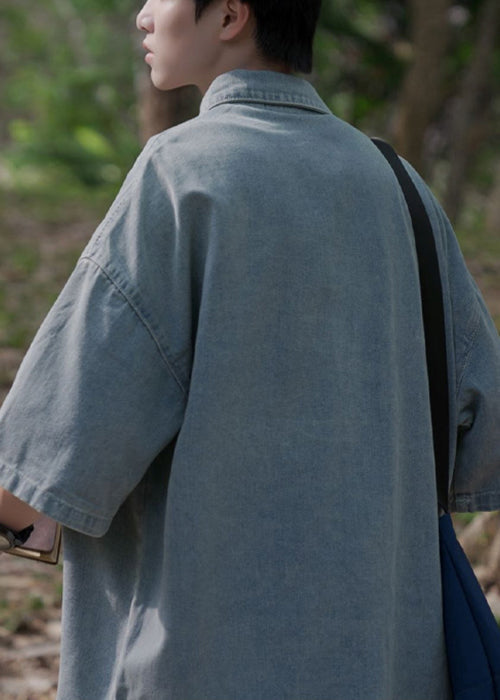 Vintage Hellblau Peter Pan Kragen Knopftaschen Denim Shirts Herren Sommer