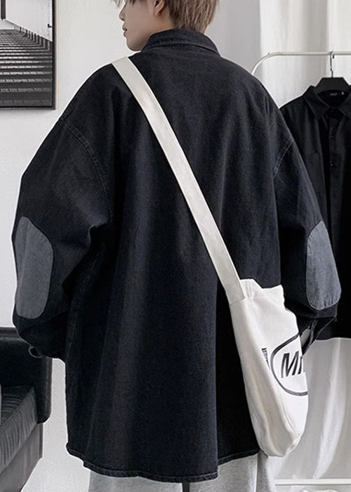 Schwarzer Knopf Lose Denim Herrenhemden Peter Pan Kragen Frühling