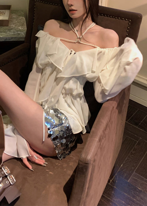 Edles, weißes, gerüschtes, geschnürtes Chiffonhemd mit langen Ärmeln KK089