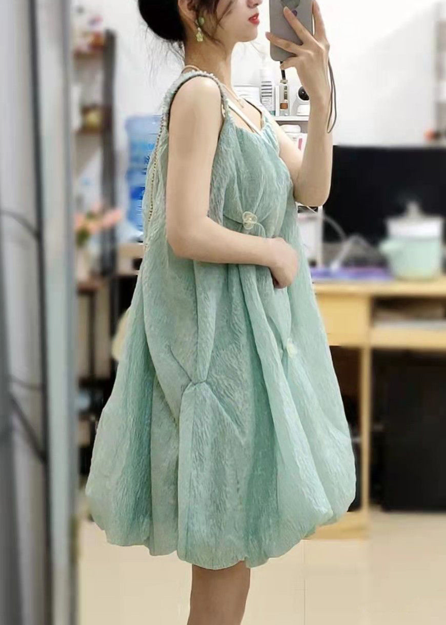 Elegant Green Square Collar Original Design Cotton Spaghetti Strap Dress Sleeveless